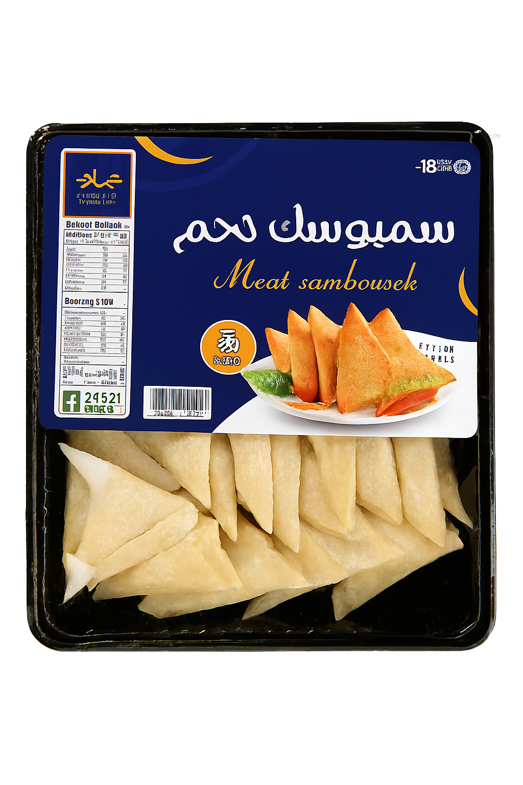 Frozen sambousek filled with seasoned minced beef, ready to fry or bake.
