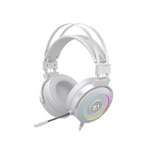 Redragon gaming headset in white with RGB lighting and high-quality microphone.